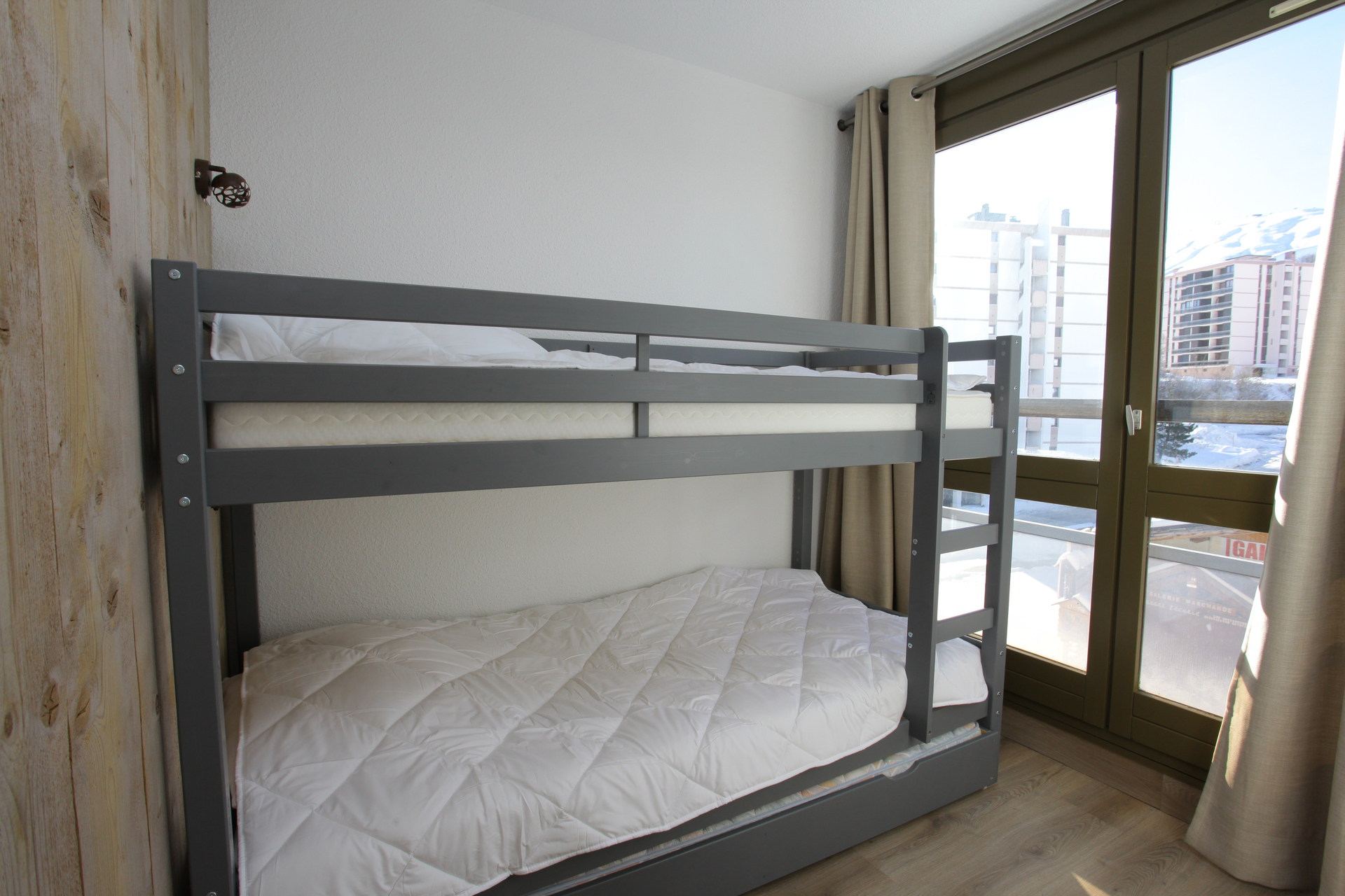 - an alcove, separated from the livingroom by curtains, with 2 bunk beds (higher beds are not appropriate for kids under 6) + one pull-out single bed