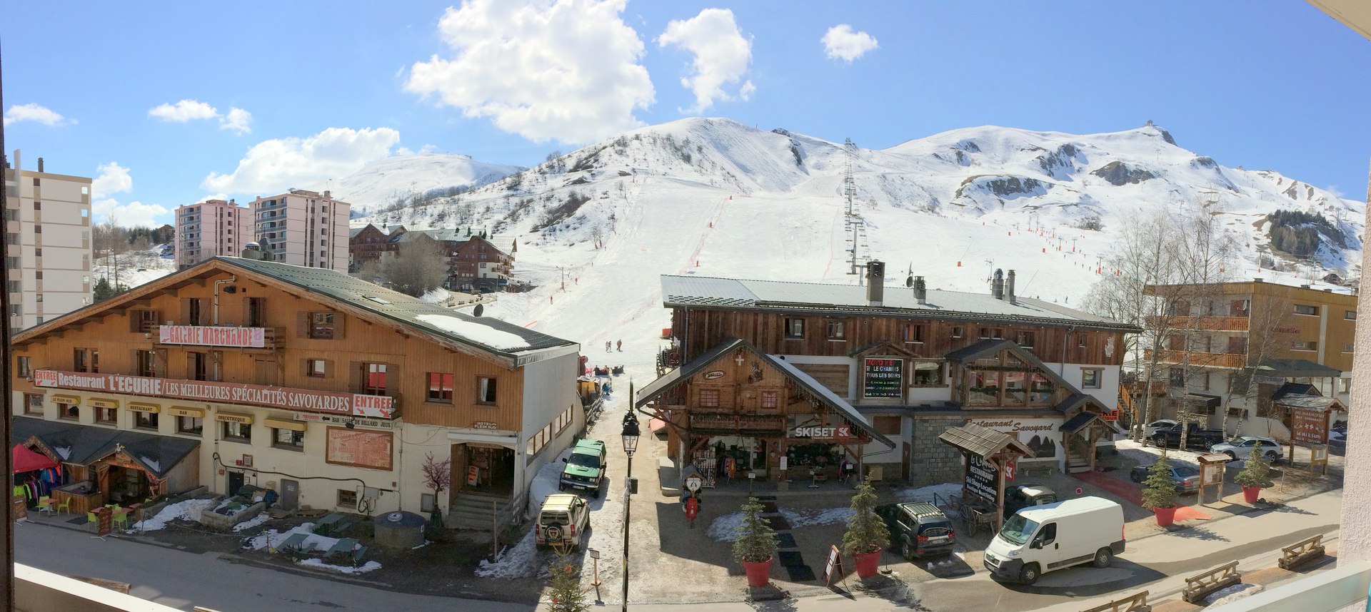 the Residence Ravière II, it is located in the station center, on top of the shops of the main street, facing the ski slopes departure (n°114 on the map station)