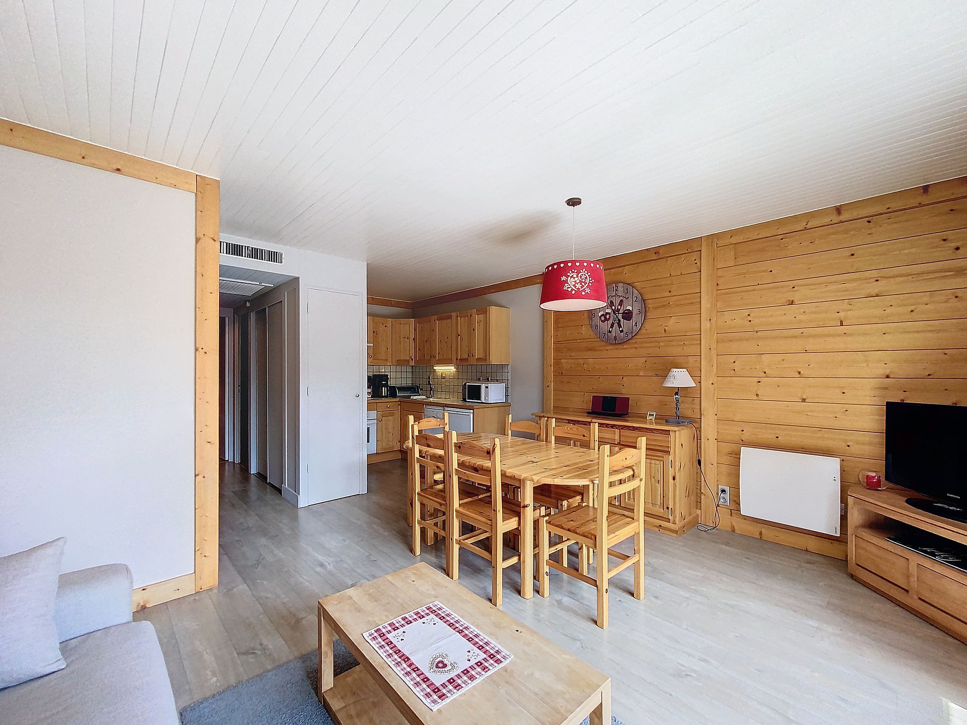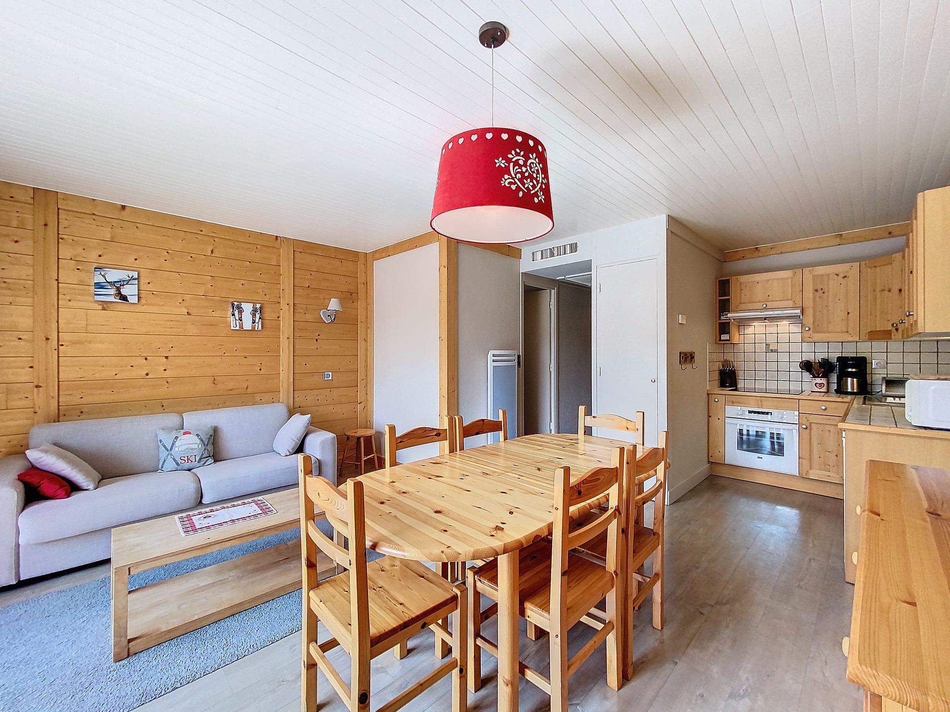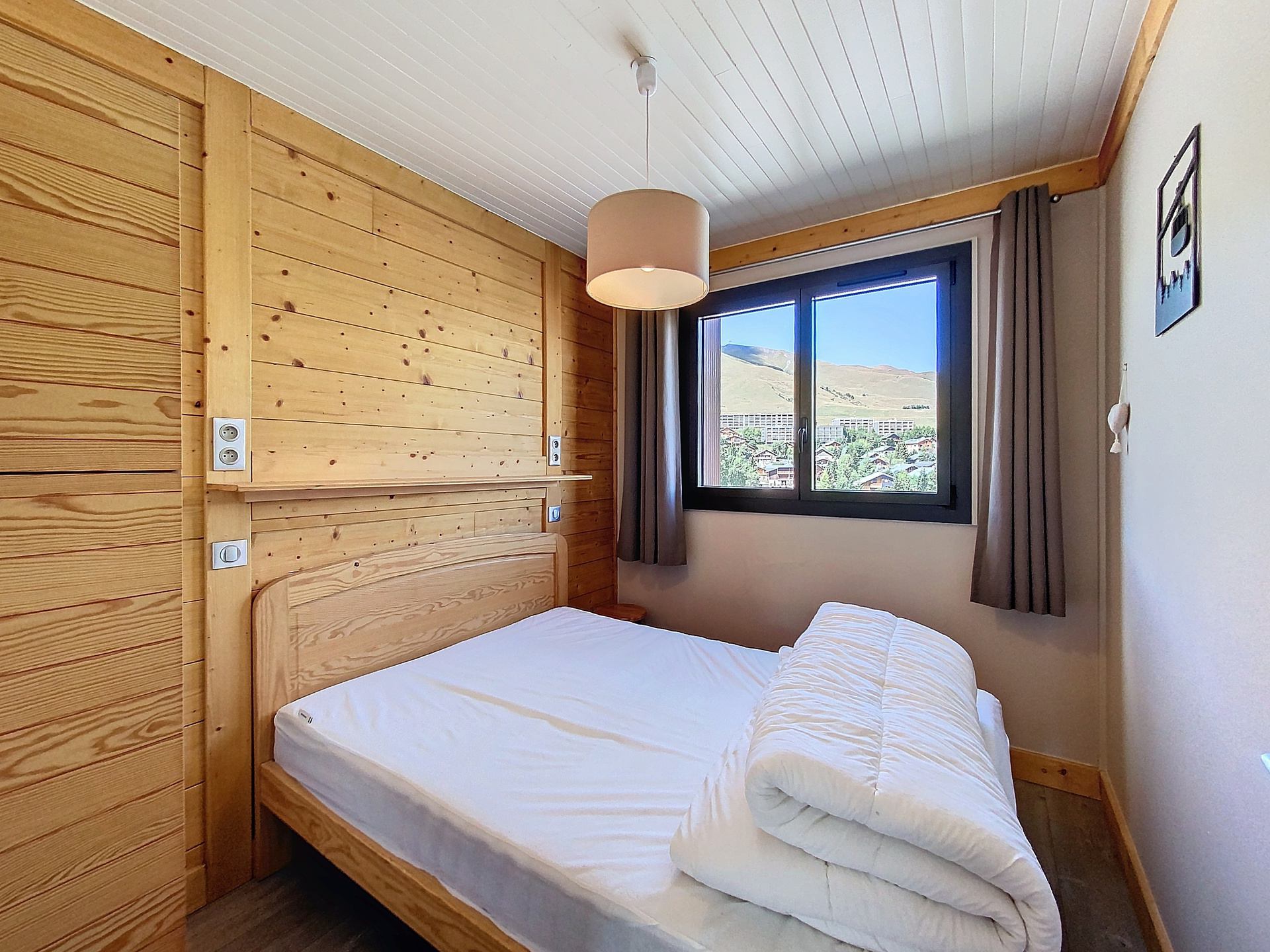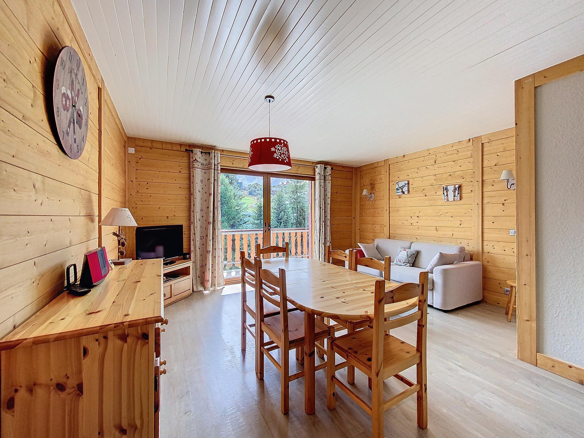 A beautiful and bright 2 bedroom apartment, fully renovated in a mountain style, well organised, with a South facing balcony and a view on the slope Les Plans. It is located at the beginning of the main shopping street and close to the slopes (n°109 on the map station).