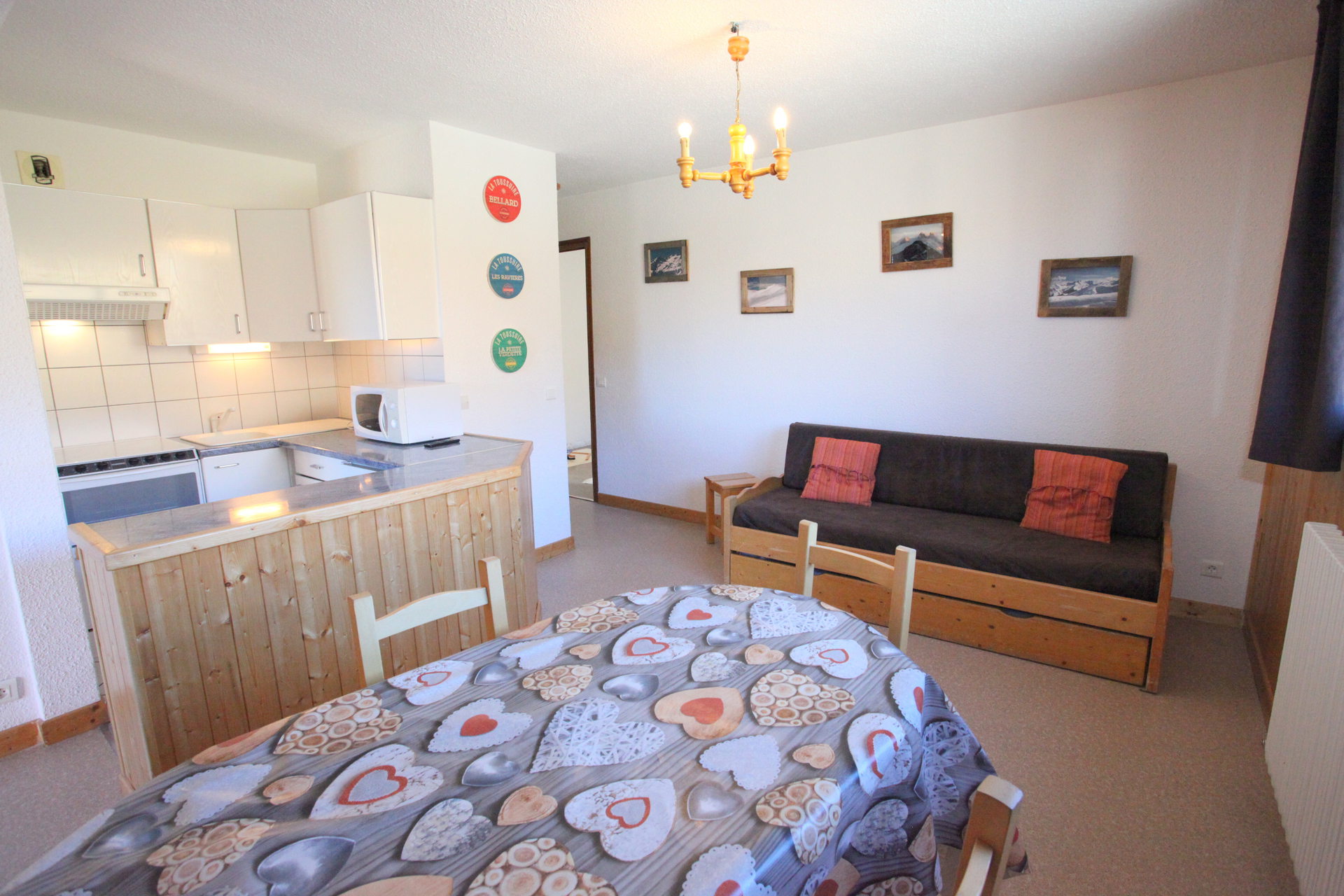Spacious and bright 5 sleeping apartment, on 2nd floor of a renovated chalet, with a balcony. Ideally located close to the ski slopes departure and shops (n°76 on the map station).